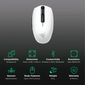 razer mouse orochi v2 white and black wireless and bt 18000 dpi wireless https://computown-lb.com/product/razer-mouse-orochi-v2-wireless/ https://www.razer.com/gaming-mice/razer-orochi-v2 Form Factor Right-Handed Connectivity Razer™ HyperSpeed 2.4GHz wireless + Bluetooth® Battery life Up to 425 hours (2.4Ghz), 950 hours (BLE) with included AA battery RGB Lighting None Sensor Optical Max Sensitivity (DPI) 18000 Max Speed (IPS) 450 Max Acceleration (G) 40 Programmable Buttons 6 Switch Type 2nd-gen Razer™ Mechanical Mouse Switches Switch Lifecycle 60 Million Clicks On-board Memory Profiles 1 Mouse Feet Undyed PTFE mouse-feet Cable None Tilt Scroll Wheel None Size Length: 108.0 mm / 4.25 in Width: 62.6 mm / 2.46 in Height:…